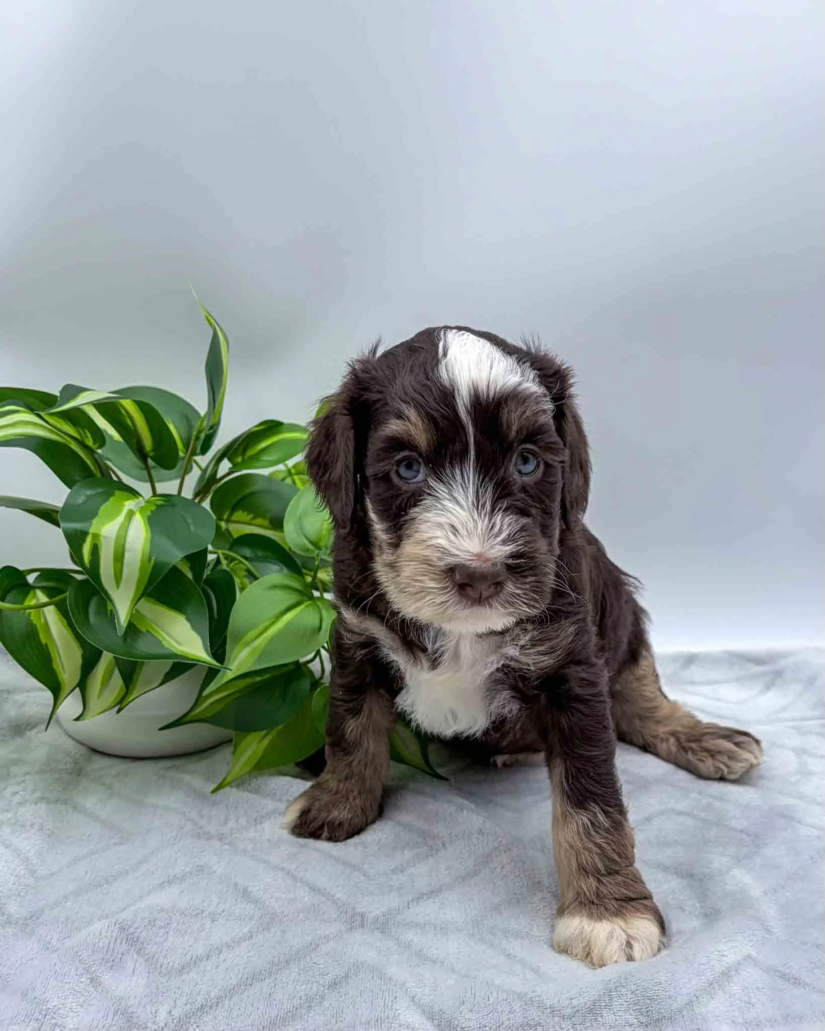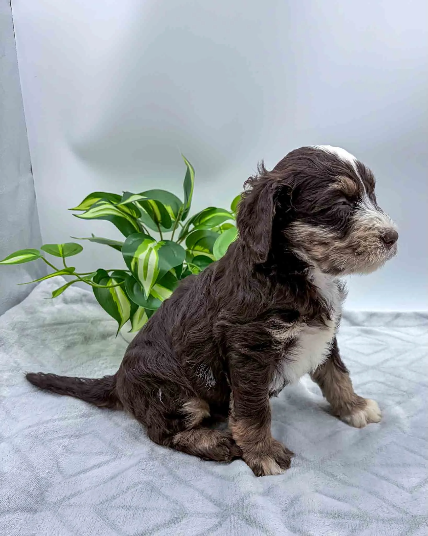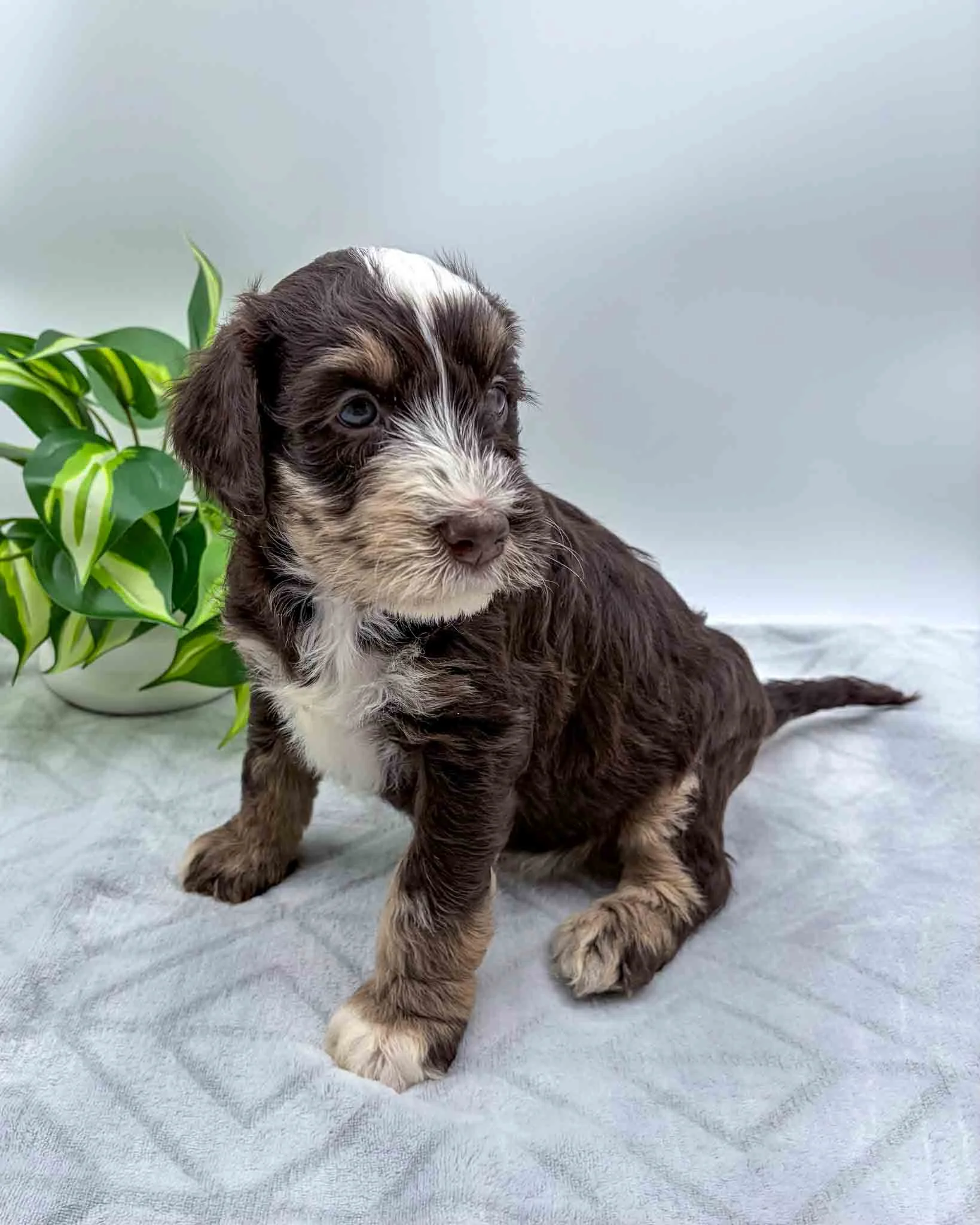 Chocolate Tri Mini Bernedoodle, White on chest and face