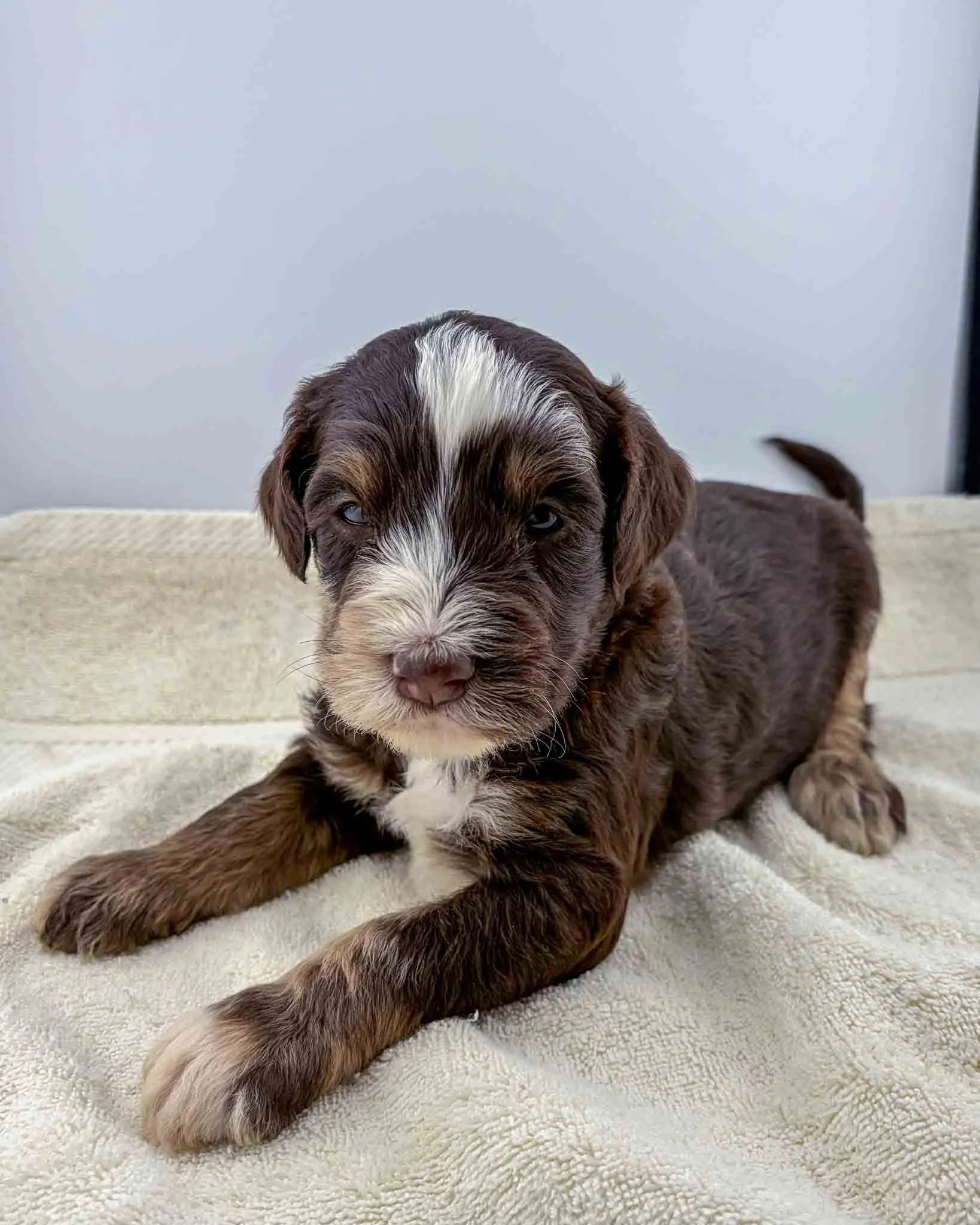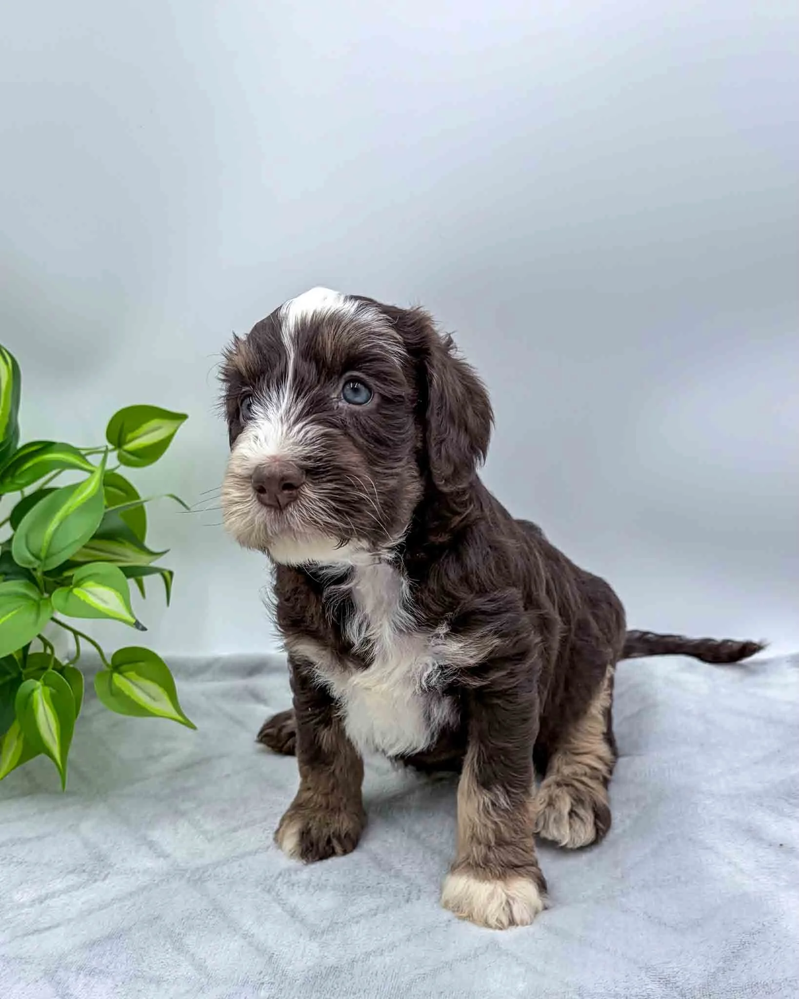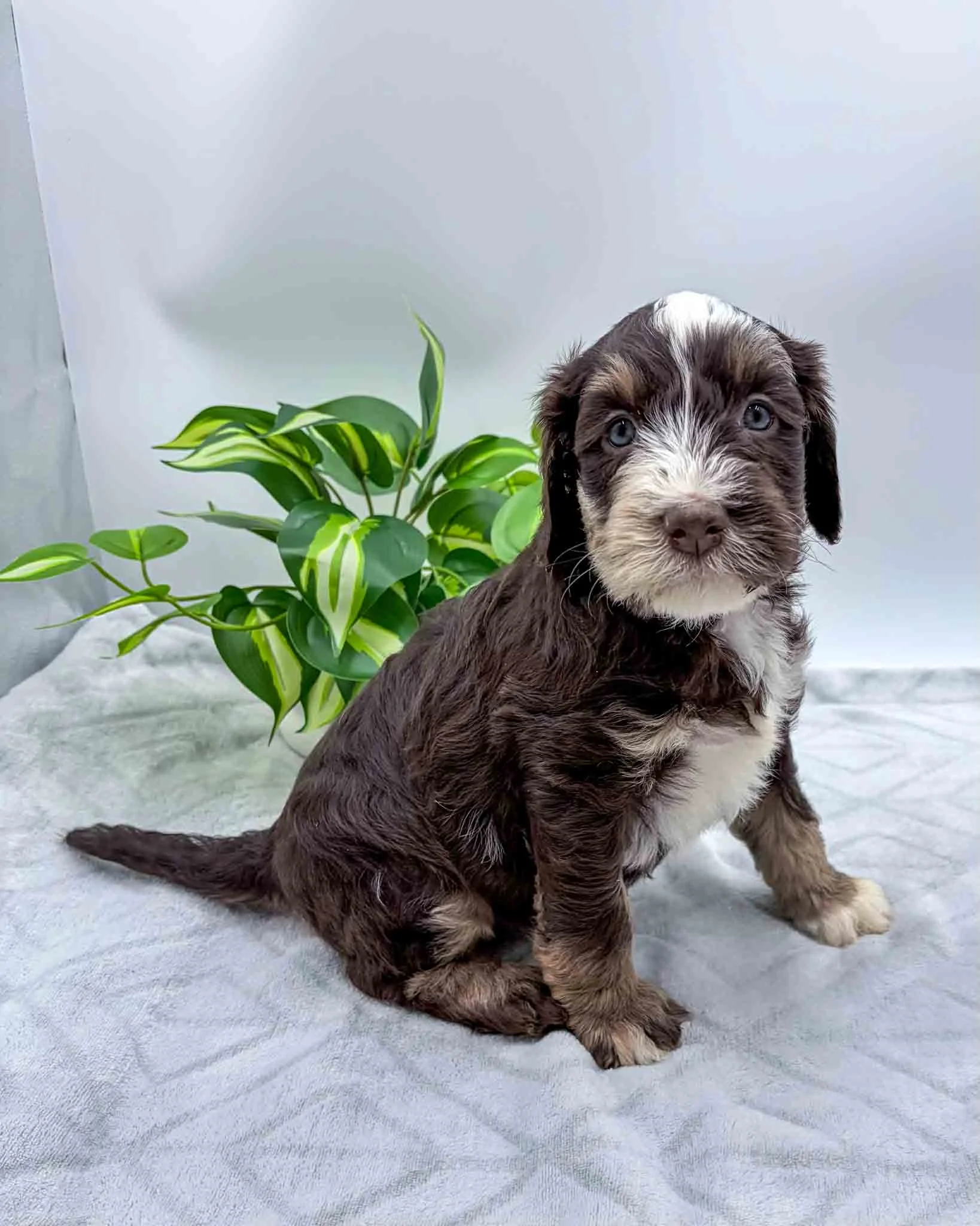Chocolate Tri Mini Bernedoodle, White on chest and face